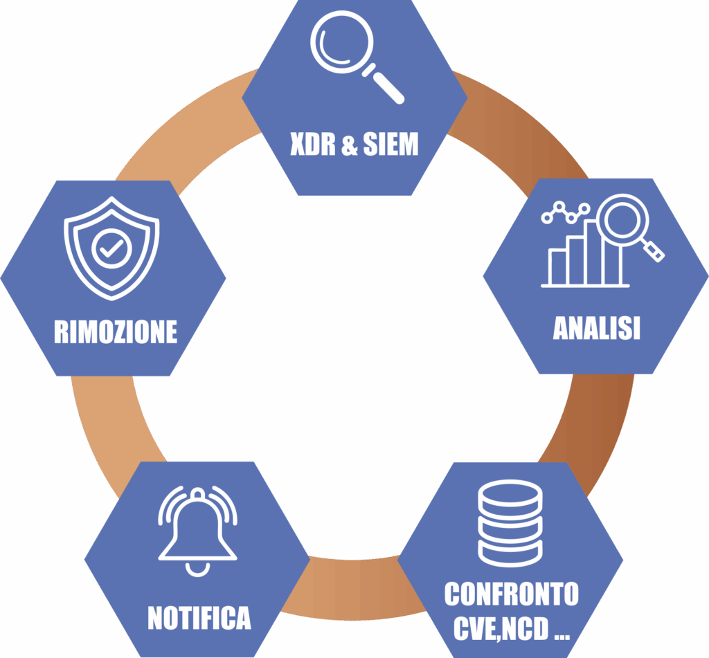 Attraverso un ciclo strutturato di rilevazione, analisi, notifica e rimozione, ti garantiamo una postura di sicurezza sempre aggiornata e conforme agli standard internazionali.